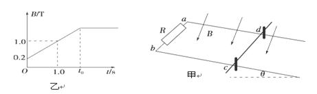 5、计算题 (10分)两根平行金属导轨固定倾斜放置,与水平面夹角为37°,相距d=0.5 m,a、b间接一个电阻为R=1.5 Ω.在导轨上c、d两点处放一根质量m=0.05 kg的金属棒,bc长L=1 m,金属棒与导轨间的动摩擦因数μ=0.5.金属棒与导轨接触点间电阻r=0.5 Ω, 金属棒被两个垂直于导轨的木桩顶住而不会下滑,如图甲所示.在金属导轨区域加一个垂直导轨斜向下的匀强磁场,磁场随时间的变化关系如图乙所示.重力加速度g=10 m/s2.(sin 37°=0.6,cos 37°=0.8).求: