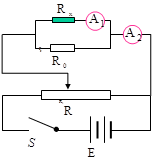 、截距为 ,请写出待测电压表内阻表达式 =?。参考答案:①?乙?②变阻箱的阻值R③C④b/k 本题解析:①本题通过作图像求电压表的电阻,如果用甲图,由于电压表内阻很大,调整滑动变阻器过程中,整个电路的电流变化范围不大,测量数据较少,实验误差较大;如果用乙图,由于变阻箱电阻调节范围较大,电流变化范围较大,可以测量较多的数据,所画的图像误差较小,所以用乙图测量。②测量原理为:E=U+IR=U+UR/RV,1/U=R/ERV+1/E,则截距为b=1/E,斜率为k=1/ERV,则需要测量的量为电压表的电压U和变阻箱的电阻R。③据1/U=R/ERV+1/E,需要做1/U-R图象。④据以上分析,RV=1/kE=b/k。 本题难度:一般 4、实验题 用以下器材测量待测电阻RX的阻值 参考答案:①(6分) 本题解析:①本实验中没有电压表,可用两个电流表测量,量程大的放在干路,量程小的放在支路②由欧姆定律 本题难度:一般 5、填空题 如图所示的电路中,R1、R2为标准电阻.测定电源电动势和内阻时,如果偶然误差可以忽略不计,则电动势的测量值比真实值________,内阻的测量值比真实值________,测量误差产生的原因是________. 参考答案:没有误差?偏大?电流表有内阻 本题解析:设电流表的内阻为RA,电源的电动势和内阻真实值分别为E′和r′,则有: 本题难度:简单 |