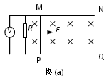2、计算题 如图(a)所示,平行金属导轨MN、PQ光滑且足够长,固定在同一水平面上,两导轨间距L=0.25m,电阻R=0.5Ω,导轨上停放一质量m=0.1kg、电阻r=0.1Ω的金属杆,导轨电阻可忽略不计,整个装置处于磁感强度B=0.4T的匀强磁场中,磁场方向竖直向下,现用一外力F沿水平方向拉杆,使其由静止开始运动,理想电压表的示数U随时间t变化的关系如图(b)所示。试分析与求: