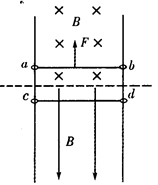 3、选择题 如图所示,足够长金属导轨竖直放置,金属棒ab、cd均通过棒两端的环套在金属导轨上.嘘线上方有垂直纸面向里的匀强磁场,虚线下方有竖直向下的匀强磁场.ab、cd棒与导轨间动摩擦因数均为