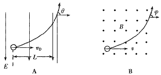 5、计算题 汤姆生在测定阴极射线荷质比时采用的方法是利用电场、磁场偏转法,即测出阴极射线在匀强电场或匀强磁场中穿过一定距离时的偏角。设匀强电场的电场强度为E,阴极射线垂直电场射入,穿过水平距离L后的运动偏角为θ(θ较小,θ≈tanθ,如图A所示);以匀强磁场B代替电场,测出经过同样长的一段弧长L的运动偏角为φ (如图B),试以E、B、L、θ、φ表示组成阴极射线粒子比荷q/m的关系式。