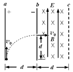 1、选择题  如图所示,竖直放置的两块很大的平行金属板a、b,相距为d,ab间的电场强度为E,今有一带正电的微粒从a板下缘以初速度v0竖直向上射入电场,当它飞到b板时,速度大小不变,而方向变为水平方向,且刚好从高度也为d的狭缝穿过b板而进入bc区域,bc区域的宽度也为d,所加电场大小为E,方向竖直向上,磁感强度方向垂直纸面向里,磁场磁感应强度大小等于E/v0 ,重力加速度为g,则下列关于粒子运动的有关说法正确的是