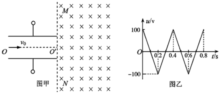 3、计算题  如图甲所示,两平行金属板间接有如图乙所示的随时间t变化的交流电压u,金属板间电场可看做均匀、且两板外无电场,板长L=0.2m,板间距离d=0.1m,在金属板右侧有一边界为MN的区域足够大的匀强磁场,MN与两板中线OO′ 垂直,磁感应强度 B=5×10-3 T,方向垂直纸面向里。现有带正电的粒子流沿两板中线OO′连续射入电场中,已知每个粒子的速度v0=105m/s,比荷 =108C/kg,重力忽略不计,在每个粒子通过电场区域的极短时间内,电场可视为恒定不变。求: