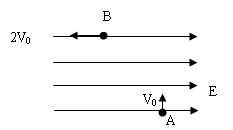 4、计算题 如图,一质量m=1×10-6kg,带电量q= -2×10-8C的小球以初速度v0竖直向上从A点射入一水平向右的匀强电场,当小球运动到比A高h=0.2m的B点时速度大小是2v0,但方向水平,且AB两点的连线在水平方向的距离为d =0.1m,g取10m/s2,求: