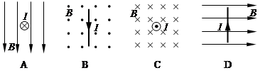 2、选择题 如图所示,通电导线均置于匀强磁场中, 其中导线不受安培力作用的是( )