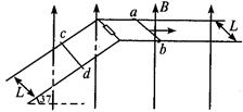 2、计算题 两根相距为L=1m的足够长的金属导轨如图所示放置,一组导轨水平,另一组平行导轨与水平面成37°角,拐角处连接一阻值为R=1Ω的电阻。质量均为m=1kg的金属细杆ab、cd与导轨垂直接触形成闭合回路,杆与导轨之间的动摩擦因数均为μ=0.5,导轨电阻不计,两杆的电阻均为R=1Ω。整个装置处于磁感应强度大小为