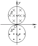 4、简答题  两个圆形区域内存在着匀强磁场,这两个圆的半径都是r,圆心都在y轴上,两圆相切,切点恰是原点O.两圆内磁场的磁感强度大小相同,但方向相反,上面的沿-z方向,下面的沿+z方向,如图所示.在坐标原点O处有一个放射源,放射出质量为m、电量为-q的带电粒子(重力不计),如果所有粒子都在xOy平面内,初速度大小都是v0,并且向各个方向的发射是均匀的.不计各粒子在运动过程中的相互作用.