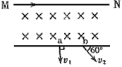 3、计算题  如图所示,两电子沿MN方向射入两平行直线间的匀强磁场,并分别以 的速度射出磁场。则