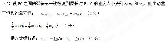 由于A在炸药爆炸后再次追上B的时候弹簧恰好第一次恢复到原长,则在A追上B之前弹簧已经有一次被压缩到最短,(即弹性势能最大)爆炸后取BC和弹簧为研究系统,当弹簧第一次被压缩到最短时BC达到共速vBC,此时弹簧的弹性势能最大,设为
