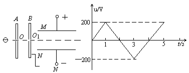 m,加上U=20v的恒定偏转电压,而在A、B板间加如右图所示的变化电压u。试求(1)在u随时间变化的第一个周期内,电子在哪段时间内不能从B板孔