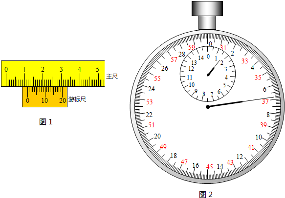 (4)实验中测量得小球的直径的示数如图1所示,图中游标尺上有20个等分刻度,则小球的直径d为______mm.用秒表记下了单摆振动50次的时间如图2所示,由图可读出时间为______s.