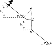 2、计算题 2009哈尔滨第24届大学生冬季运动会的高山滑雪。有一滑雪坡由AB和BC组成,AB是倾角为37°的斜坡,BC是半径为R=5m的圆弧面,圆弧面和斜面相切于B,与水平面相切于C,如图所示,AB竖直高度差hl=8.8m,竖直台阶CD高度差为h2=5m,台阶底端与倾角为37°斜坡DE相连.运动员连同滑雪装备总质量为80kg,从A点由静止滑下通过C点后飞落到DE上(不计空气阻力和轨道的摩擦阻力,g取10m/s2,sin37°=0.6,cos37°=0.8).求: