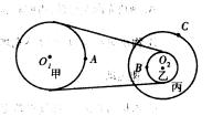 5、选择题 如图所示的皮带传动装置中,甲、乙、丙三轮的轴均为水平轴,其中甲、丙两轮半径相等,乙轮半径是丙轮半径的一半.A、B、C三点分别是甲、乙、丙三轮的边缘点,若传动中皮带不打滑,则
