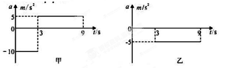 1、选择题  2012年6月9日晚,受沿线焚烧秸杆产生烟雾影响,宁洛高速公路安徽省蒙城段发生多起多点车辆追尾事故。假设髙速公路上甲、乙两车在同一车道上同向行驶.甲车在前.乙车在后.速度均为 v0=30m/s.甲乙相距s0=l00m,t=0时刻甲车遇紧急情况后,甲、乙两车的加速度随时间变化如图所示.取运动方向为正方向.下面说法正确的是