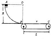 5、计算题 如图所示,竖直平面内四分之一光滑圆弧轨道AP和水平传送带PC相切于P点,圆弧轨道的圆心为O,半径为R=5m。一质量为m=2kg的小物块从圆弧顶点由静止开始沿轨道下滑,再滑上传送带PC,传送带可以速度v=5m/s沿顺时针或逆时针方向的传动。小物块与传送带间的动摩擦因数为
