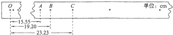 2、填空题 利用“验证机械能守恒定律”的实验装置也可以测量重物运动的速度和加速度,如图是质量为m的重物自由下落过程中打点计时器在纸带上打出的一系列点,选取一条符合实验要求的纸带,O为纸带下落的起始点,A、B、C为纸带上选取的三个连续点.已知打点计时器的打点时间间隔T=0.02s,那么