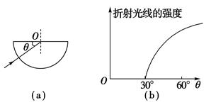参考答案:解:由sinC= 本题解析: 本题难度:一般 4、计算题 一束细光束由真空沿着径向射入一块半圆柱形透明体,如图(a)所示,对其射出后的折射光线的强度进行记录,发现折射光线的强度随着θ的变化而变化,如图(b)的图线所示,求此透明体的临界角和折射率。 参考答案:60° 本题解析:从图像中可以看出当 本题难度:简单 5、计算题 如图,一透明半圆柱体折射率为n=2,半径为R、长为L。一平行光束从半圆柱体的矩形表面垂直射入,从部分柱面有光线射出。球该部分柱面的面积S。 参考答案:解:半圆柱体的横截面如图所示,OO"为半径。设从A点入射的光线在B点处恰好满足全反射条件,由折射定律有 本题解析: 本题难度:一般 |