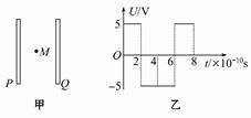 3、计算题 如图甲所示,两个平行金属板P、Q竖直放置,两板间加上如图乙所示的电压。t=0时,Q板比P板电势高5V,此时在两板的正中央M点有一个电子仅受电场力作用从静止开始运动,假设电子始终未与两板相碰。在0<t<8×10 10s的时间内,这个电子处于M点的右侧、速度向左且逐渐减小的时间范围是。