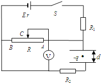 (1)若液滴恰好能处于静止状态,电压表的示数是多少?若此时滑动变阻器的滑动触头C正好在变阻器正中点,那么滑动变阻器的最大阻值Rm是多大?
