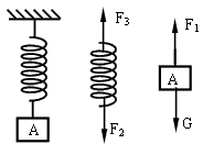 1、选择题 重物A用一根轻弹簧悬于天花板下,画出重物和弹簧的受力图如图所示。关于这几个力的以下说法正确的是?