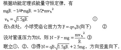 1、简答题  有一段中空的绝缘管被弯成半径为R的1/4圆弧形,现把它放置在竖直平面内,且处在磁感强度为B的匀强磁场中,磁场方向垂直竖直平面指向里面,如图所示.在与圆心O处于同高度的管口a处自由投放一质量为m、电量为+q的小球,因有摩擦,当小球滑到管口b时损失机械能1/4·mgR,求小球在b处时对管道的压力.