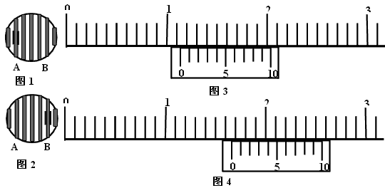 参考答案:C 本题解析:由条纹间隔公式,其它条件不变的情况下,双缝的间隙越大,光屏上产生的干涉条纹间距越小,选项C正确 本题难度:一般 4、实验题  某同学在做“双缝干涉测定光的波长”实验时,第一次分划板中心刻度线对齐A条纹中心时如图1,游标卡尺的示数如图3所示,第二次分划板中心刻度线对齐B条纹中心时如图2,游标卡尺的示数如图4所示。已知双缝间距d=0.5mm,双缝到屏的距离L=1.0m。则: