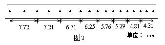 4、实验题 (2003年江苏物理)实验装置如图1所示;一木块放在水平长木板上,左侧拴有一细软线,跨过固定在木板边缘的滑轮与一重物相连,木块右侧与打点计时器的纸带相连,在重物牵引下,木块在木板上向左运动,重物落地后,木块继续向左做匀减速运动,图2给出了重物落地后,打点计时器在纸带上打出的一些点,试根据给出的数据,求木块与木板间的摩擦因数μ。要求写出主要的运算过程,结果保留2位有效数字。(打点计时器所用交流电频率为50Hz,不计纸带与木块间的拉力。取重力加速度g=10m/s2)