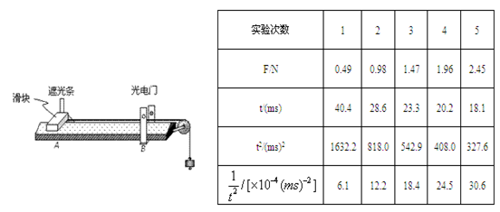5、实验题 某同学用如图所示装置“研究物体的加速度与外力关系”,他将光电门固定在气垫轨道上的某点B处,调节气垫导轨水平后,用重力为F的钩码,经绕过滑轮的细线拉滑块,每次滑块从同一位置A由静止释放,测出遮光条通过光电门的时间t。改变钩码个数,重复上述实验。记录的数据及相关计算如下表。