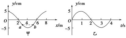 1、选择题  如图所示,甲是一列横波在某一时刻的波动图像,乙是在x=6 m处的质点从该时刻开始计时的振动图像,a、b是介质中两个质点,下列说法正确的是?