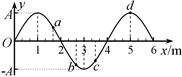 2、选择题  一列简谐横波沿x轴正方向传播,某时刻(t=0)其波形如图所示,a 、b 、c 、d是四个质元,振幅为A?下列说法中正确的是