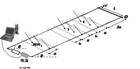 1、计算题 (22分)如图所示,两根相距为L的金属导轨固定于倾角为θ的斜面上,导轨电阻不计,一根质量为m、长为L、电阻为3R 的金属棒两端放于导轨上,金属棒与导轨间的动摩擦因数为?,棒与导轨的接触电阻不计。导轨下端连有阻值为2R的电阻和电流传感器,电流传感器与计算机相连,且其电阻忽略不计。斜面上分布着宽度为a、间距为b的2014段方向垂直于斜面向下的匀强磁场(a>b)。金属棒初始位于OO′处,与第1磁场区域相距2a,金属棒由静止开始释放。(重力加速度为g)