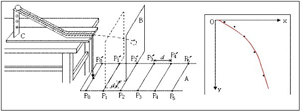 与弹簧压缩量x之间的函数关系式为?(k为比例系数)A. ? B. ? C. ? D.![]() (3)你认为 与x的关系式中的比例系数k与弹簧的什么因素有关?参考答案:(1) 本题解析:(1)由平抛运动规律有 本题难度:一般 5、实验题 某同学设计了一个研究平抛运动的实验。实验装置示意图如图所示,A是一块平面木板,在其上等间隔地开凿出一组平行的插槽(图中 参考答案:(1)斜槽末端水平 保持小球水平抛出的初速度相同 本题解析:(1)为了保证小球从斜槽末端开始做平抛运动,就得使斜槽末端保持水平;据机械能守恒定律mgh=mv2/2可知,当小球释放高度相同时,小球每次运动到斜槽末端都可以获得相同速度。(2)往后平移d是为了保证相邻点迹的时间相同,往内平移d是为了获得图中的相同水平距离。(3)如图所示。 本题难度:一般 |