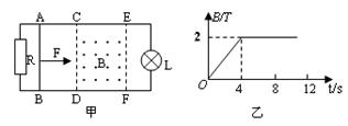 3、计算题 如图甲所示,水平面上有两电阻不计的光滑金属导轨平行固定放置,间距d=0.5m,导轨左端通过导线与阻值为2Ω的电阻R连接,右端通过导线与阻值为4Ω的小灯泡L连接。在矩形区域CDFE内有竖直向上的匀强磁场,CE长为2m,CDFE区域内磁场的磁感应强度B随时间变化的关系如图乙所示,在t=0时,一阻值为2Ω的金属棒在水平恒力F作用下由静止开始从AB位置沿导轨向右运动,在金属棒从AB位置运动到EF位置的过程中,小灯泡的亮度没有发生变化,求: