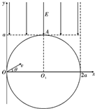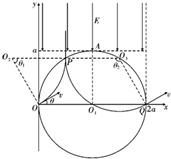 4、简答题 如图所示,在坐标系xOy内有一半径为a的圆形区域,圆心坐标为O1(a,0),圆内分布有垂直纸面向里的匀强磁场.在直线y=a的上方和直线x=2a的左侧区域内,有一沿y轴负方向的匀强电场,场强大小为E.一质量为m、电荷量为+q(q>0)的粒子以速度v从O点垂直于磁场方向射入,当速度方向沿x轴正方向时,粒子恰好从O1点正上方的A点射出磁场,不计粒子重力.