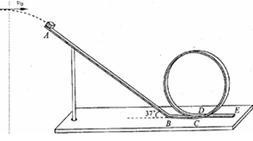 3、计算题 成都七中某课外兴趣小组同学为了研究过山车的原理,提出了下列设想:取一个与水平方向夹角为37°、长L=2.0m的粗糙的倾斜轨道AB,通过水平轨道BC与竖直圆轨道相连,出口为水平轨道DE,整个轨道除AB段以外都是光滑的。其中AB与BC轨道以微小圆弧相接,如图所示。一个质量m=1kg的小物块以初速度v0=4.0m/s,从某一高处水平抛出,到A点时速度方向恰沿AB方向,并沿倾斜轨道滑下。已知物块与倾斜轨道的动摩擦因数μ=0.50(g取10m/s2,sin37°="0.60" ,cos37°=0.80)求: