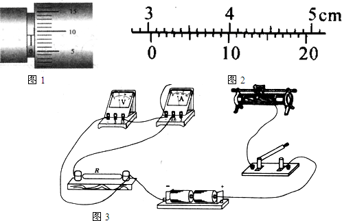 5、简答题 (1)用螺旋测微器测量一根电阻丝的直径,测量结果如图1其读数为______mm. 用游标为20分度的卡尺测量一工件的直径,测量结果如图2所示,此工件的直径为______mm?. (2)(11分)某同学要测一约为5Ω的未知电阻,为此取来两节新的干电池、电键和若干导线及下列器材: A.电压表O~3V,内阻10kΩ?B.电压表O~15V,内阻50kΩ C.电流表0~0.6A,内阻0.05Ω?D.电流表O~3A,内阻0.01Ω E.滑动变阻器,0~15Ω?F.滑动变阻器,O~200Ω ①要求较准确地测小其阻值,电压表应选______,电流表应______,滑动变阻器 应选______.(填序号) ②实验中他的实物接线如图3所示,请指出该学生实物接线中的错误有哪些? A.______;B______;C.______;D.______;E.______.