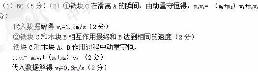 (2)如图所示,A、B两木块靠在一起放于光滑的水平面上,A、B的质量分别为mA=2.0kg和mB=1.5kg。一个质量为mC=0.5kg的小铁块C以v0=4m/s的速度滑到木块A上,离开木块A后最终与木块B一起匀速运动。木块A在铁块C滑离后的速度为vA=0.4/m/s。求: