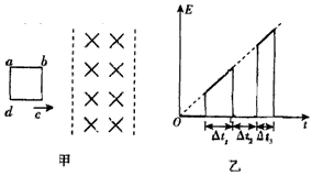 5、计算题 如图甲所示,在光滑绝缘的水平面上,放有一个粗细均匀的单匝正方形线圈abcd。在外力的作用下从静止开始向右运动,穿过固定不动的、有理想边界的匀强磁场区,磁感应强度的大小为B,磁场区的宽度大于线圈的边长。若测得线圈中产生的感应电动势E的大小和运动时间t的变化关系如图乙所示。已知图象中的三段时间分别为△t1,△t2和△t3,且在△t2时间内外力为恒力。