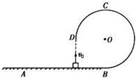 圆轨道BCD固定在水平面AB上,轨道圆心为O,半径R=lm,轨道最低点与水平面相切于B点,C为轨道最高点,D点与圆心O等高。一质量m=1Kg的小物块,从水平面上以速度V0竖直向上抛出,抛出的初速度v0 =8m/s,物块从D点进入圆轨道,最终停在A点。若A、B间的距离为8m。g=l0m/s2。求:
