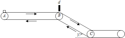 4、简答题 (B)如图所示的装置是某工厂用于产品分拣的传送带示意图,产品(可以忽略其形状和大小)无初速地放上水平传送带AB的最左端,当产品运动到水平传送带最右端时被挡板d挡住,分拣员在此鉴定产品质量,不合格的被取走,合格品被无初速地放在斜向传送带BC的顶端,滑至底端的传送带后再进行包装等工序.已知传送带AB、BC与产品间的动摩擦因数μ=0.5,均以v=4m/s的速度按图示方向匀速转动,水平传送带AB长L1=12m,斜向传送带BC长L2=1.64m,倾角α=37°(sin37°=0.6,cos37°=0.8,g=10m/s2),求: