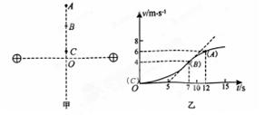 4、选择题 两个等量同种电荷固定于光滑水平面上,其连线的中垂线上有A、B、C三点,如图甲所示。一个电荷量为2×l0 -6C、质量为lg的小物块从该水平面内的C点静止释放,其运动的v-t图象如图乙所示,其中B点处为整条图线切线斜率最大的位置(图中标出了该切线)。则下列说法正确的是:(?)