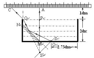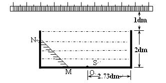 )dm,OM=1dm,在容器中央正上方1dm 处水平水平放置一足够长的刻度尺,求光源S发出的光经平面镜反射后,照射到刻度尺上的长度。(不考虑容器侧壁和液面的反射)