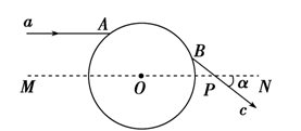 2、计算题 如图所示,MN是一条通过透明球体球心的直线,一条平行于MN的光线a射向此球体,若出射光线c与MN的交点P和球心O的距离是球半径的