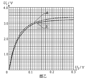 (3) 实验二:将LED置于80℃的热水中,测量得到LED的U1 —U2曲线为图乙中的b曲线。由此可知:温度升高,LED的电阻将?(填“增大”、“减小”或“不变”)。