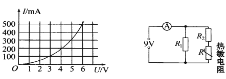 (2)他将这个热敏电阻接入如下右图所示的电路中,已知电源电压为9V,R1=30Ω,内阻不计的毫安表读数为500mA,则R2的阻值为________Ω。