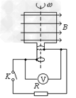 3、填空题 如图线圈的面积2.0×103cm2,共100匝。处在B=0.5T的匀强磁场中,以50周/秒的转速匀速转动,已知线圈电阻为1Ω,外接电阻为9Ω,电键K合上后电压表的读数是__________,以图示位置为计时零点,写出电流的表达式__________。