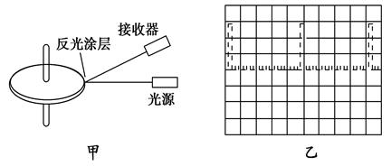 1、实验题 如图甲是利用激光测转速的原理示意图,图中圆盘可绕固定轴转动,盘边缘侧面上有