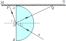 代入解得 r=60° 由几何知识得,△OPQ为直角三角形, ∠APO=r=60°. 根据反射定律和几何知识得知,∠AQO=i=30° 所以两个光斑PQ之间的距离 L=PA+AQ=Rtan30°+2Rsin60° 解得 L=40