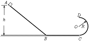 4、计算题 如图所示,在竖直平面内,由倾斜轨道AB、水平轨道BC和半圆形轨道CD连接而成的光滑轨道,AB与BC的连接处是半径很小的圆弧,BC与CD相切,圆形轨道CD的半径为R。质量为m的小物块从倾斜轨道上距水平面高为h=2.5R处由静止开始下滑。求: