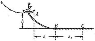 2、计算题 一个质量m=60 kg的滑雪运动员从高h=20 m的高台上的A点水平滑出,落在水平地面上的B点,落地瞬间水平速度不变,竖直方向速度变为零,运动员在水平面上滑行到C点后静止,如图所示。已知A与B、B与C之间的水平距离S1=30 m,S2=45 m,g取10 m/s2,不计空气阻力,求: